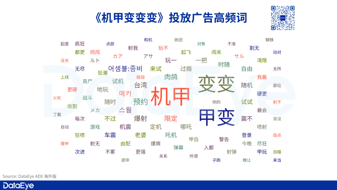 DataEye-ADX海外版数据显示,《机甲变变变》iOS版在近30天的广告素材投放中,繁体中文素材量占到67%,日语和韩语素材各占15%。