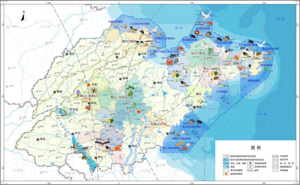 山东半岛陆海相拥、山川毓秀、平原广阔。图为《山东省国土空间规划(2021-2035年)》中的生物多样性保护规划 / [10]