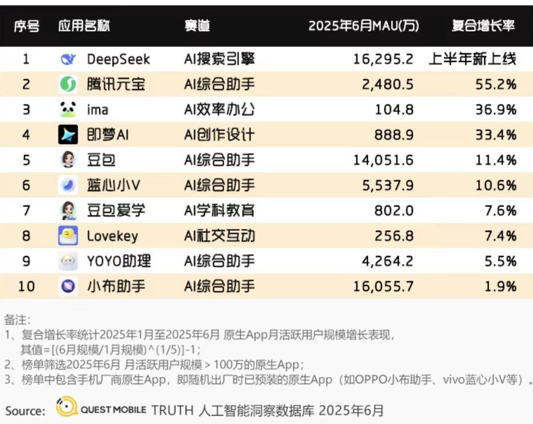 推广相当有效,从2月到3月,腾讯元宝日活激增超20倍。另据QuestMobile数据,今年上半年,67.4%的原生App负增长。但腾讯元宝却逆行向上,以55.2%的同比增速,位居上半年AI原生App用户规模飙升榜的第二名,仅次于Deepseek,不过其用户量相比字节的豆包还差距不小。