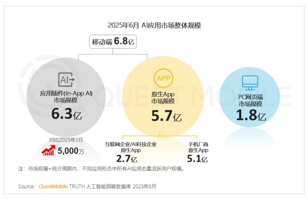 据QuestMobile报告,截止到2025年6月,“移动端-应用插件(In-App AI)”用户规模6.3亿,“移动端-原生App”用户规模为5.7亿,“PC网页应用”用户规模为1.8亿,相比3月份分别增长0.5亿、下降0.2亿、下降0.3亿。其中,67.4%的原生App在今年上半年经历了负增长。
