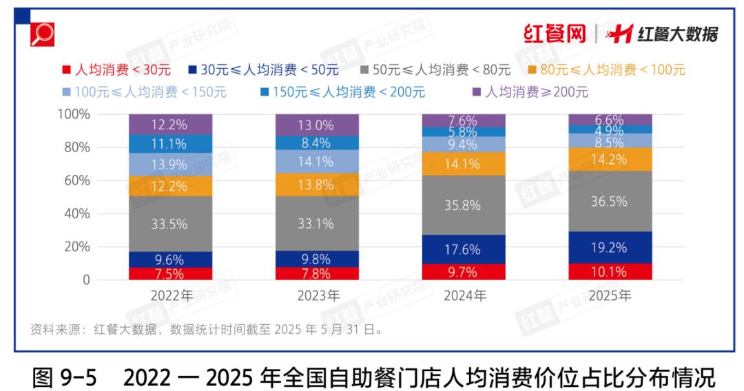 从自助餐的人均消费来看,人均消费在100元以下的“平价自助”门店数量占比持续增长。红餐大数据显示,截至2025年5月,人均消费在100元以下的自助餐门店数占比为 80%,这一比例较2022年提升了17.2个百分点。