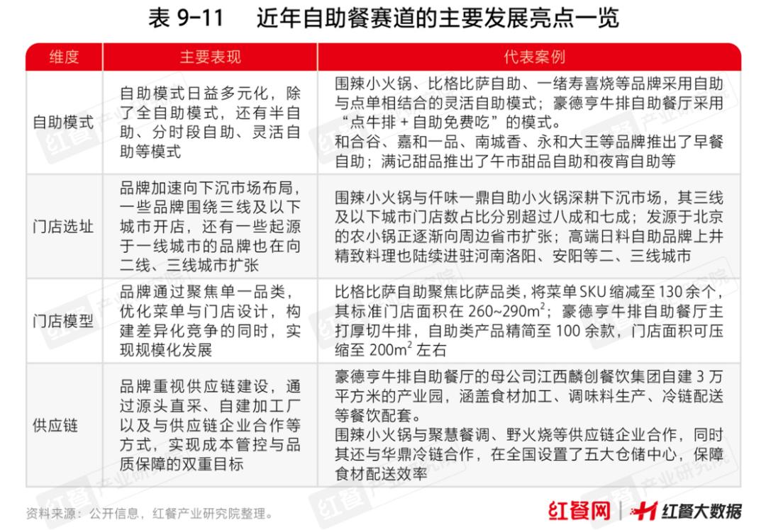此外,诸如面包自助、面馆自助、饺子自助、小龙虾自助、麻辣烫自助、快餐自助、早茶自助等不同类型的自助餐厅也在不断涌现。而一些非自助餐领域的品牌也引入了自助模式,以提升消费者体验和拓宽消费场景,如庆丰包子铺、满记甜品、南城香、永和大王、必胜客等,粤菜品牌金鼎轩还在北京开出了首家自助餐厅。