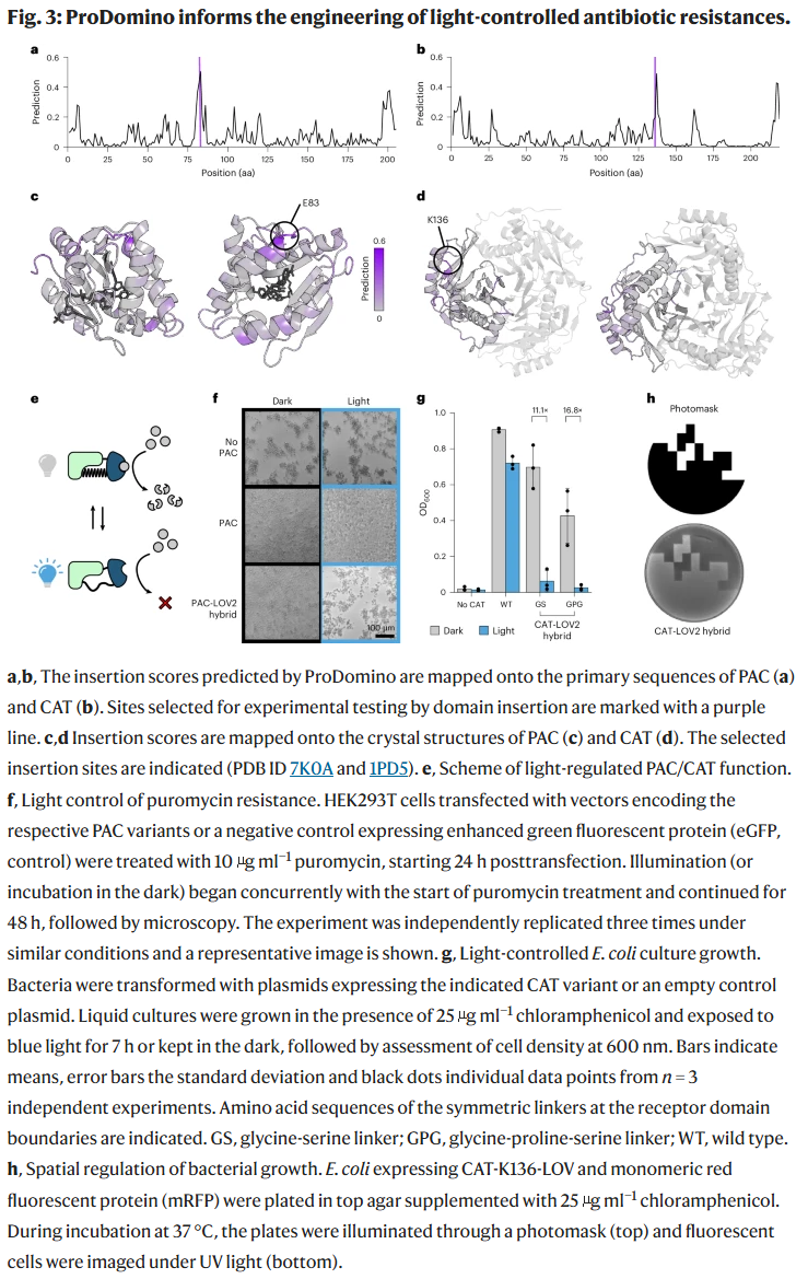研究人员将 ProDomino 应用于常用的抗生素抗性酶——嘌呤霉素乙酰转移酶(PAC)和氯霉素乙酰转移酶(CAT)。模型预测的高分位点(PAC 的 E83 和 CAT 的 K136)位于表面环区。将 AsLOV2 光受体结构域插入这些位点后,得到的融合蛋白在黑暗中保留活性,光照下活性显著下降,实现了光控抗性功能。进一步验证显示,模型在 78% 的测试位点预测正确,尤其在高分位点的成功率更高。