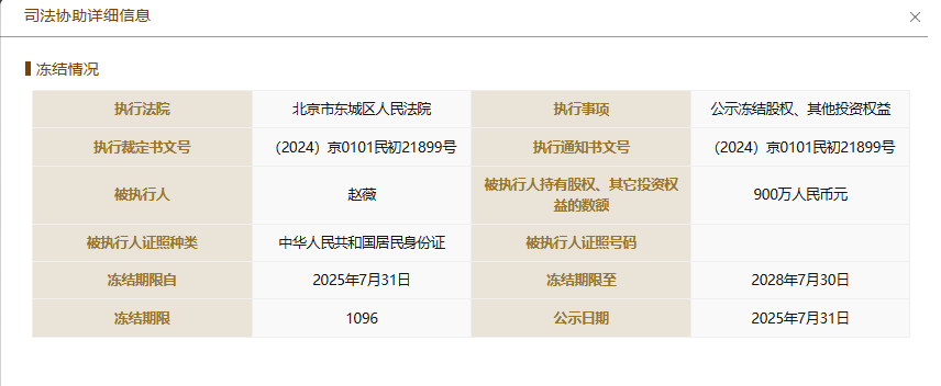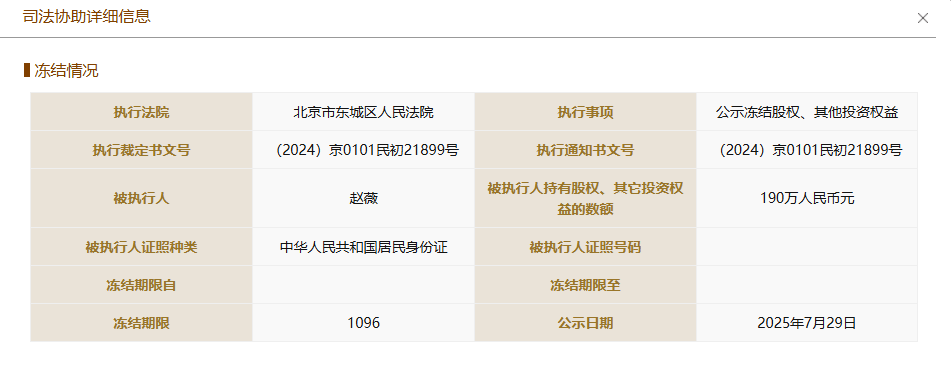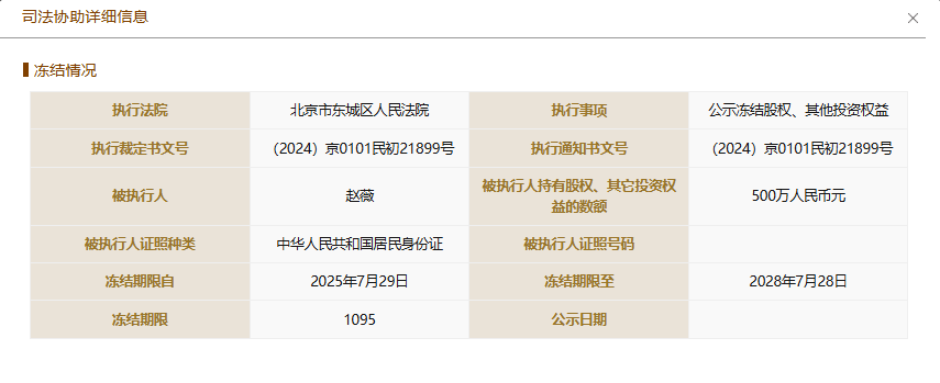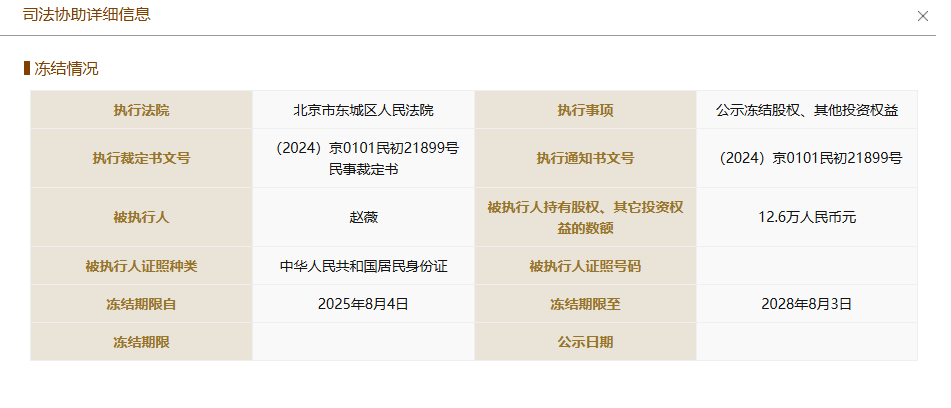 财联社8月15日讯,国家企业信用信息公示系统网站显示,8月4日,北京普林赛斯文化传播有限责任公司新增一则股权冻结信息,被执行人为赵薇,冻结股权数额210万人民币,冻结期限为3年,执行法院为北京市东城区人民法院。