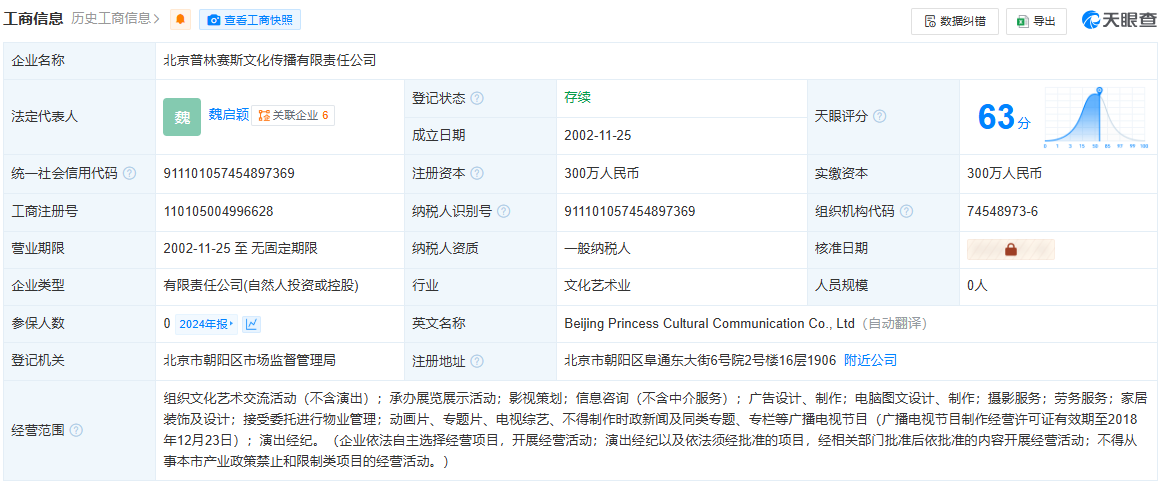 天眼查App显示,北京普林赛斯文化传播有限责任公司成立于2002年11月,法定代表人为魏启颖,注册资本300万人民币,经营范围包括承办展览展示活动、影视策划、信息咨询等。股东信息显示,该公司由赵薇、魏启颖分别持股70%、30%。