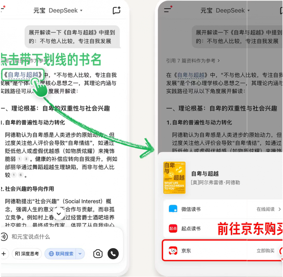 💡 腾讯元宝公众号新增与京东购书功能,用户在对话中提及京东有售书籍时,系统会自动识别并在书名下方添加下划线,同时展示书籍封面卡片,点击即可跳转至京东完成购买。