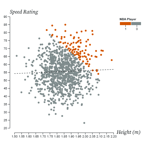 But, if you refer back to my earlier graph, you can see why choosing the NBA downplays the impact of this phenomenon. There are no limiting factors keeping the super-fast, crazy tall players out of this sample. I can’t find data on this, but the effect would surely be stronger if we only included players in the second tier of US basketball.