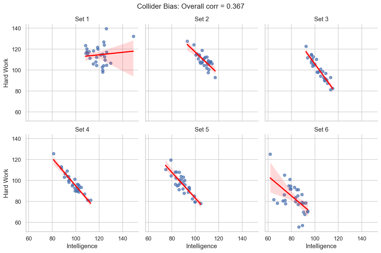 Across the whole dataset, the correlation line trends upwards, meaning that smarter people tend to be more hard-working, but we can also see that people in each set form diagonal-type bands across this distribution—within each band, the smarter you are, the less hard-working you are. Exactly the opposite effect!