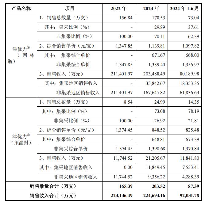 图:2022-2024年上半年津优力销售数据,来源:公司公告