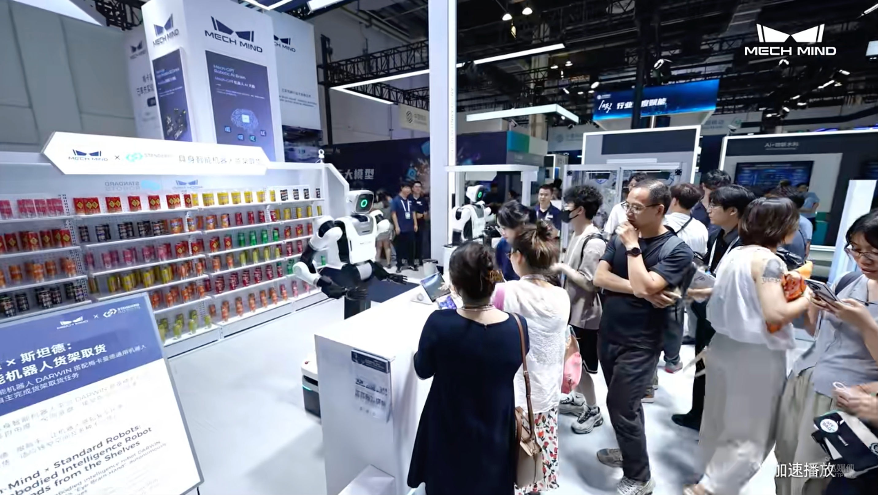 WAIC期间,人形机器人货架取货也很热闹。观众在现场下单饮料后,机器人就会自己走向货架,拿取之后再递给观众,它还能根据货架的高度随时让自己“长高变矮”。这台执行任务的斯坦德人形机器人DARWIN平台,搭配的就是我们梅卡曼德的具身智能“眼脑手”。