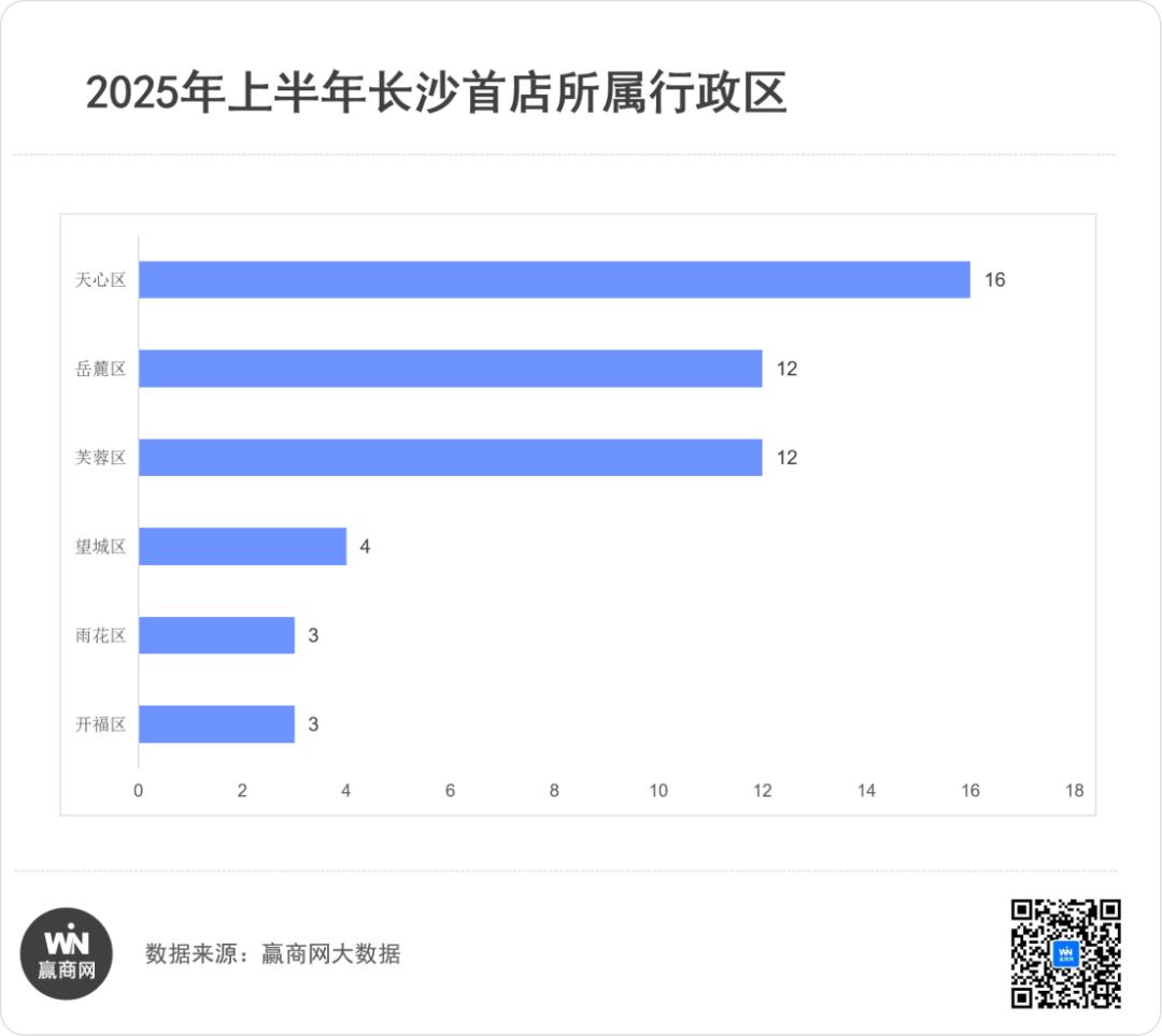 天心区上半年成功吸纳 16 家首店,这主要得益于长沙国金街、长沙悦方 ID MALL、长沙王府井百货、长沙海信广场、长沙坡子街等商业体,也展示了其所在的五一商圈所具备的强大吸引力。紧随其后的是芙蓉区与岳麓区,两区均以 12家首店的数量并列第二。