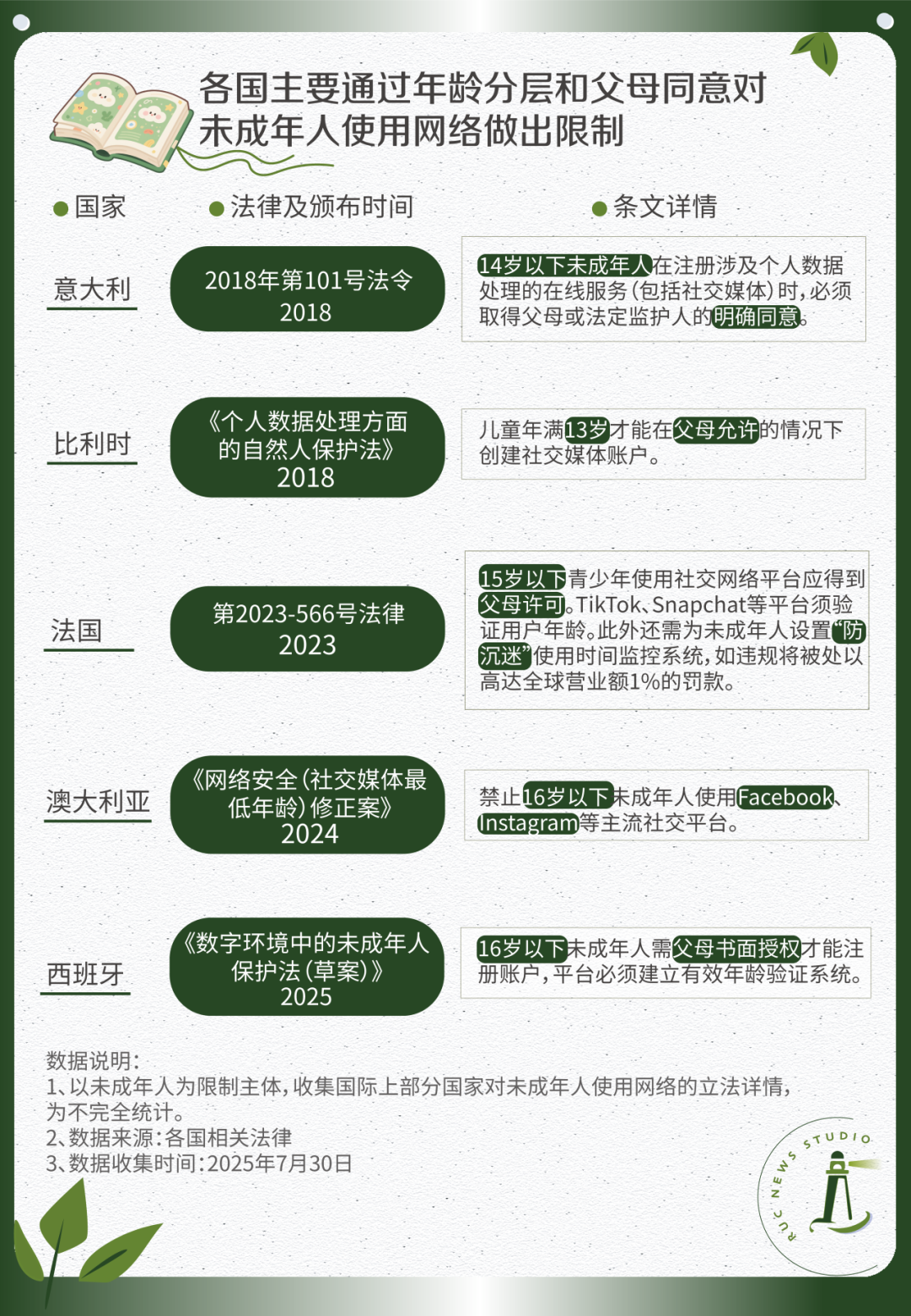 正因如此,多国通过立法手段明确平台义务和家长责任,并通过年龄分层和父母同意为未成年人划定上网边界。