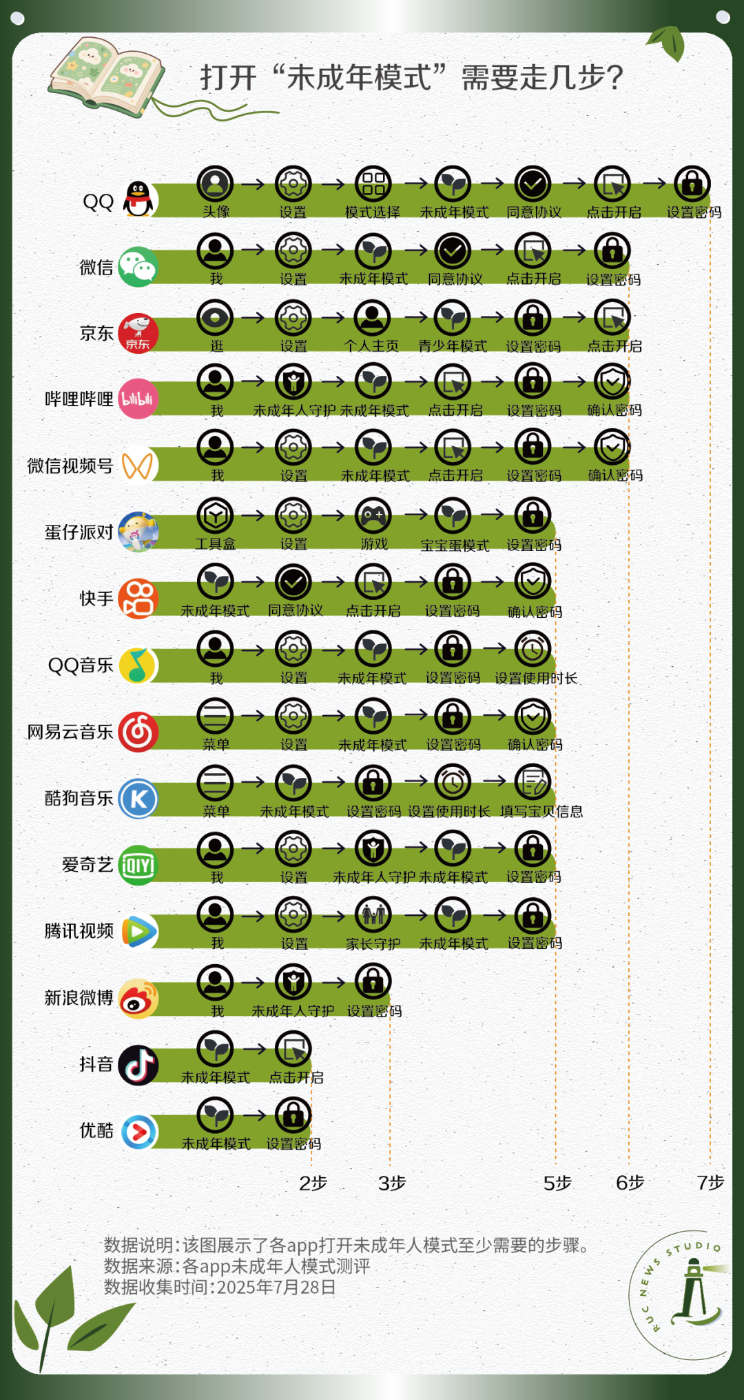 但这些模式能否真正发挥作用,首先取决于用户能否便捷找到并启用——从未成年人模式的入口来看,尽管《指南》要求入口满足“一键切换”原则,但在实际测试中,APP未成年人模式入口嵌套普遍较深,仅抖音、优酷不需要进入三级、四级页面。
