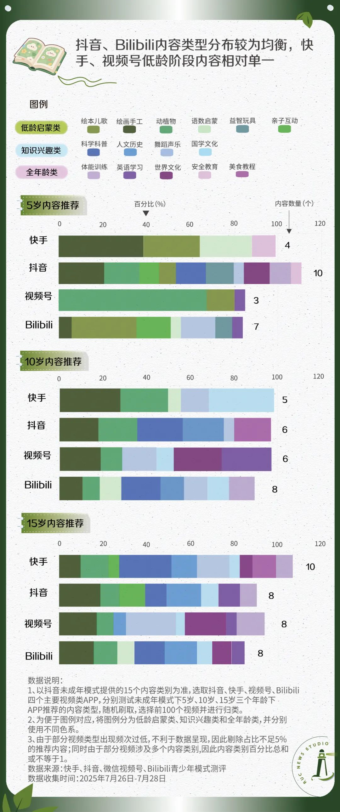 一方面,分龄化原则落实不到位;另一方面,分龄不够细致,内容重复出现的问题不断浮现。在对短视频APP不同年龄内容供给的实际测试中,我们发现,抖音和B站在三个年龄上内容丰富度较高且表现出了明显的渐进性特征,从绘本儿歌、动植物到科学科普、人文历史。