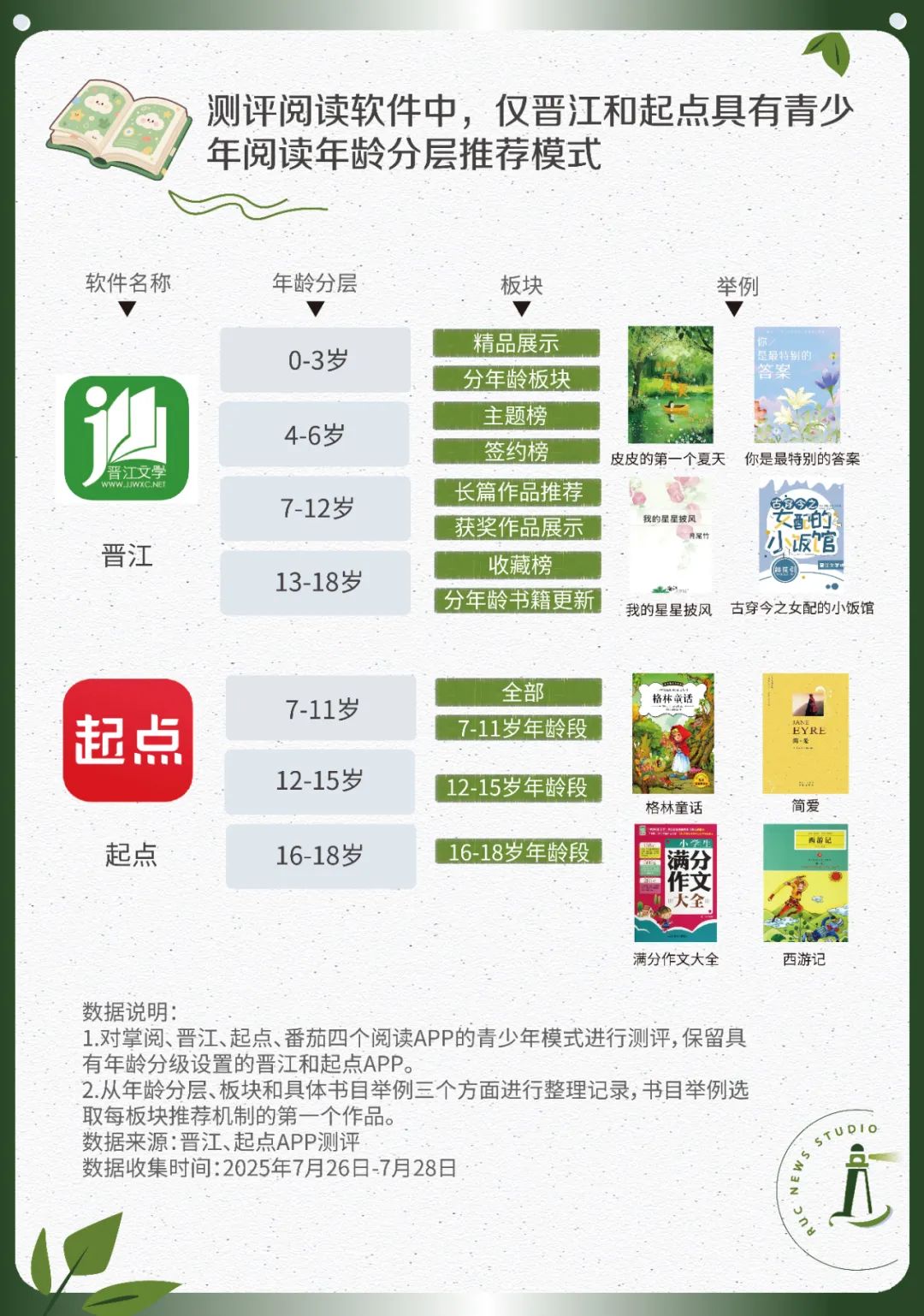 在阅读类APP中,也仅有晋江和起点根据不同年龄推荐书目。值得注意的是,晋江和起点的分龄方式都未参照《指南》设计,且两者之间各不相同。