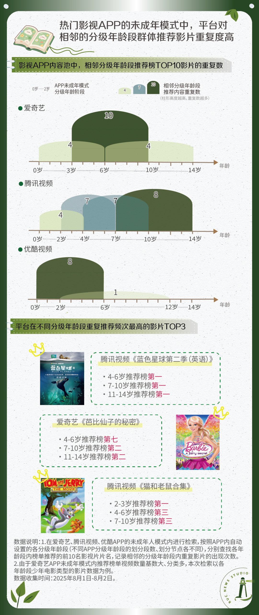 在影视类APP中,我们发现,平台推荐的内容在0至10岁的年龄段重复度较高,下至学龄前上至青少年,《蓝色星球第二季》《芭比仙子的秘密》《猫和老鼠合集》都被反复推荐。诚然,经典动画值得反复重温,但将同一批内容无差别推送给跨度近十年的未成年人,本质上也是内容丰富度和分龄精细化不足的表现。