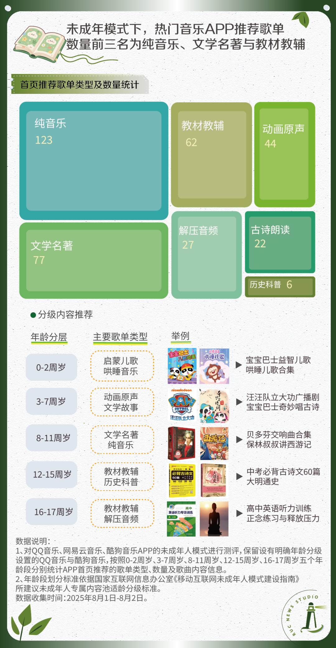 而在音乐类APP中,有分龄设置的未成年人模式更是“屏蔽”了Rap、乡村、电子、民谣等音乐类型,以纯音乐、文学名著、教材教辅朗读为主,忽略了未成年人的音乐审美需求与差异。