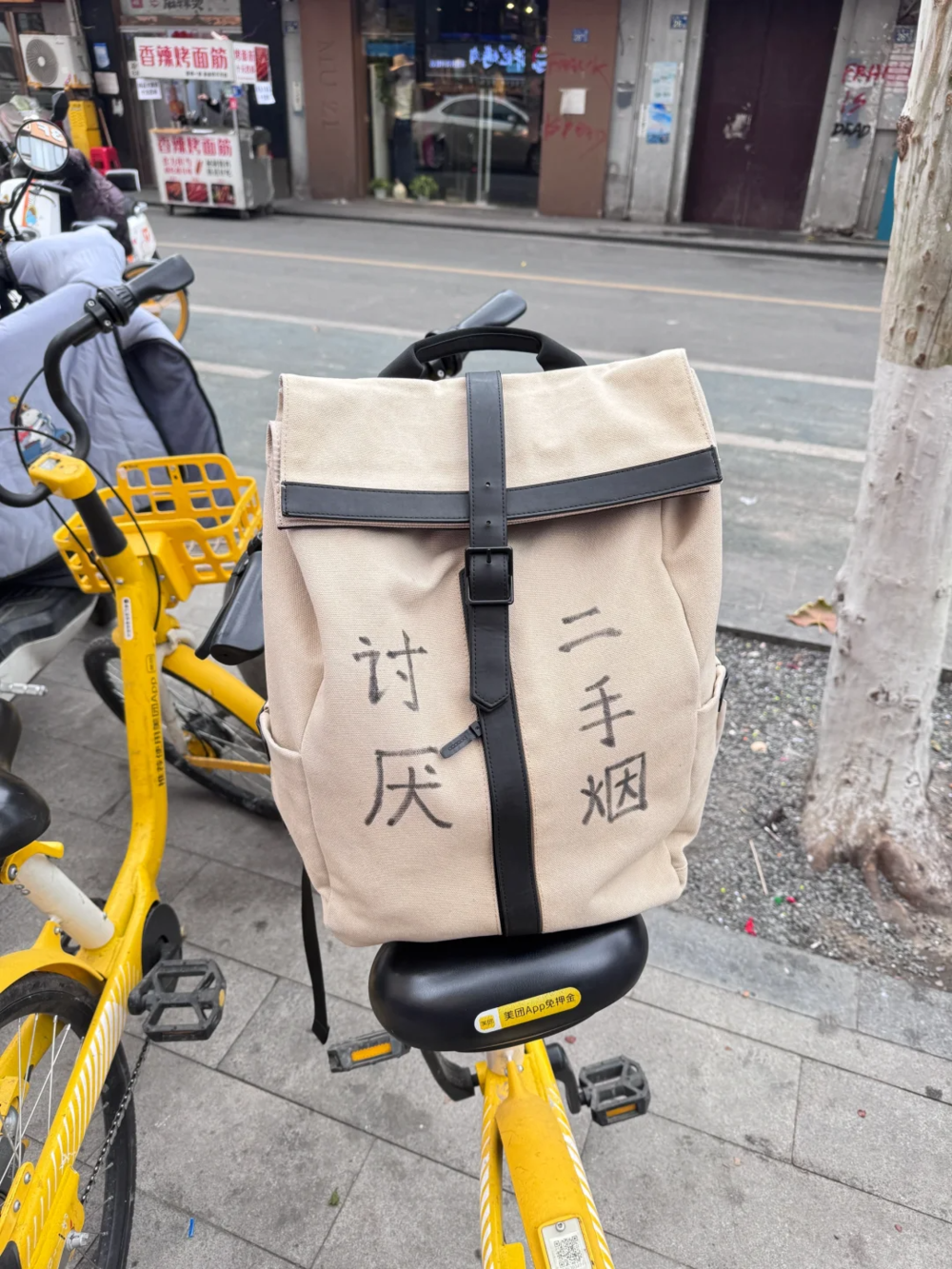 对二手烟的反抗,渗透进了苏崎生活中每一个角落。他把“拒绝二手烟”的背包挂件挂在身上,经常使用的书包上也写着“讨厌二手烟”五个大字。有一次,苏崎骑着共享单车下班,后面有一个大叔骑着电动车经过,嘴里念出挂件上的字,吐槽了一两句,扬长离开了。