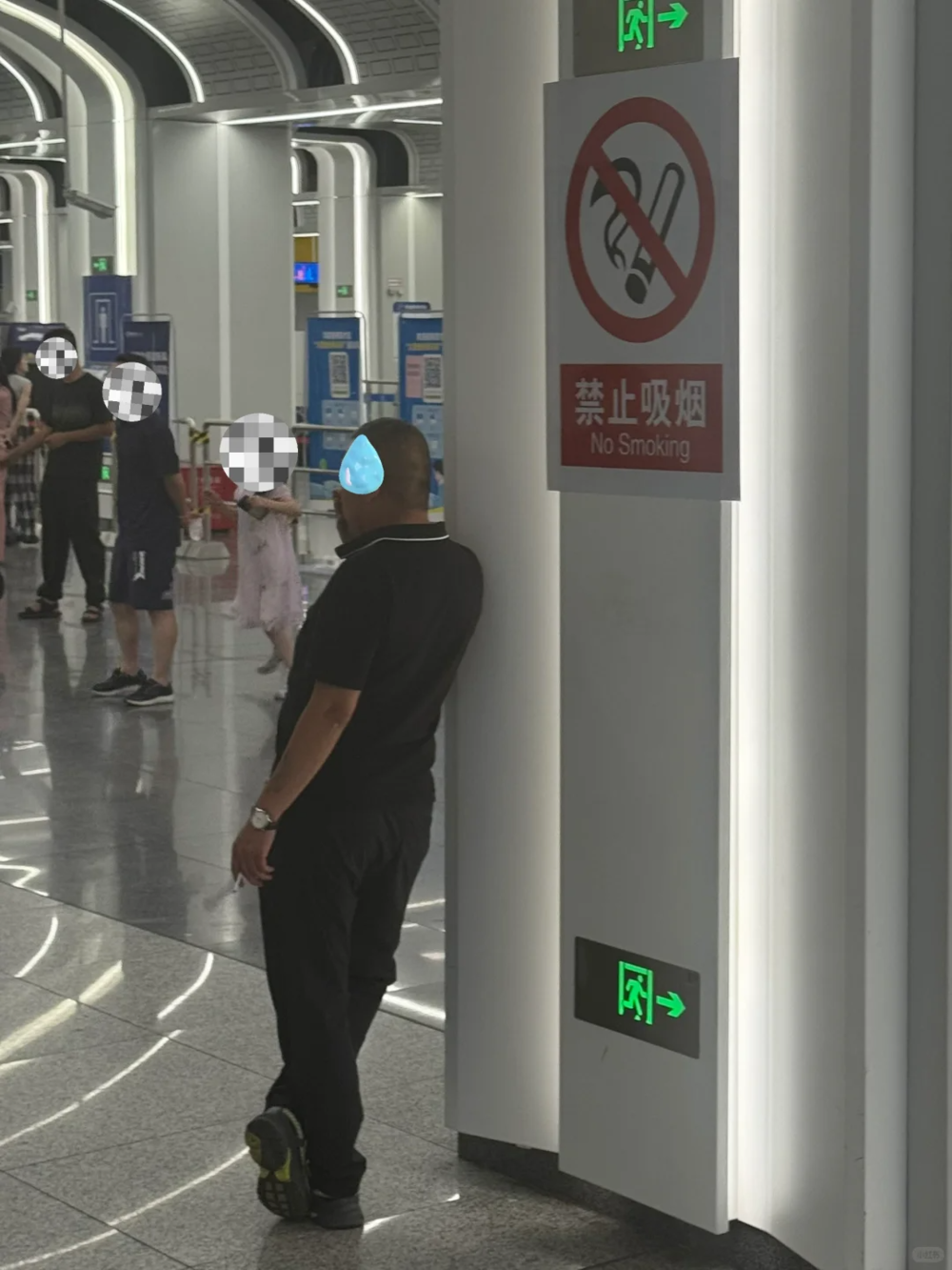 在一个封闭的车站里,有人站在“禁止吸烟”的牌子下抽烟。(图/受访者提供)