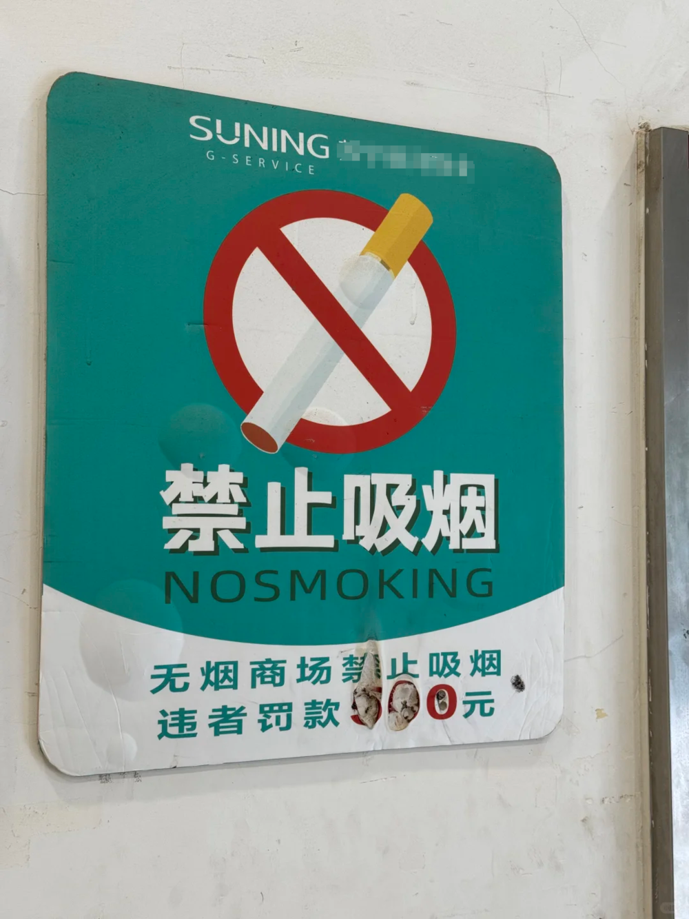 一家商场里,商场内吸烟罚款的文字被人用烟头烫坏。(图/受访者提供)