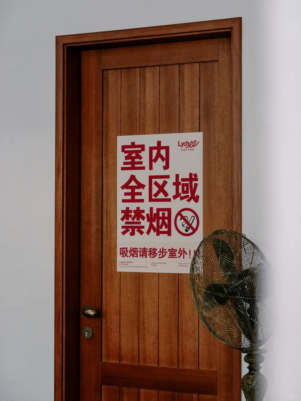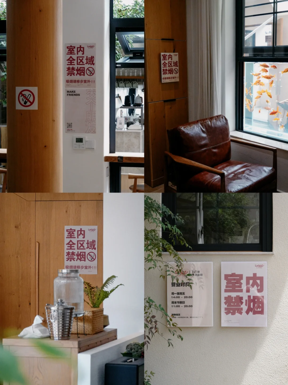 哪怕是简单扫一眼店里环境,也可以发现,咖啡店内贴了不少于十张大小不一的“禁止抽烟”的标语或图案。在咖啡店社交媒体账号的简介一栏,除了咖啡店的地址、营业时间外,还有一句“禁止吸烟,谢绝打牌”。
