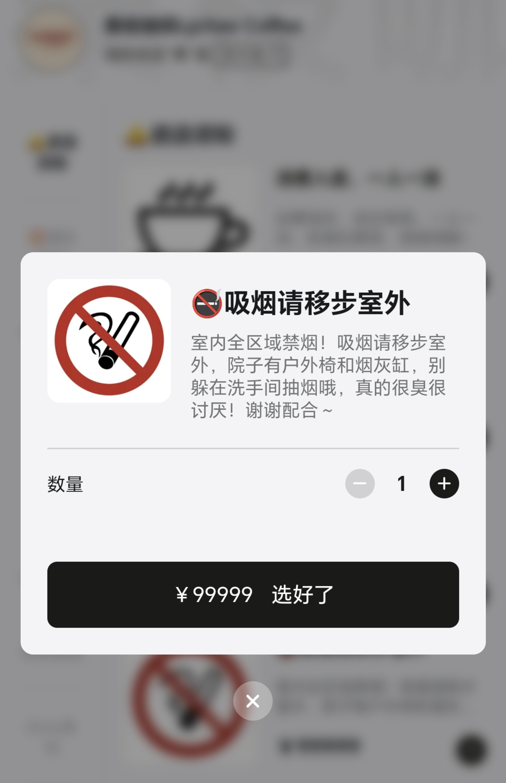 Sam告诉我,最开始开店的时候并没有这个规定。随着营业时间推移,他发现有一些素质比较低的客人,会在店内抽烟,许多不喜烟味的客人也会找他投诉。加了店内禁烟标识之后,仍然有客人无视提醒继续抽烟,Sam就继续在点单小程序最显眼的开头处,加上了一栏“吸烟请移步室外”的信息。