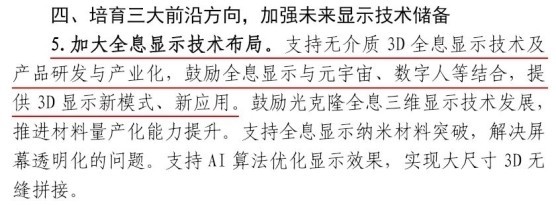近年来,国家构建了多层次政策体系支持新型显示产业。2024年1月工信部等七部门明确将全息显示列为未来产业重点方向,要求加快实现“无障碍、全柔性、3D立体”显示效果。上海此前也发布相关方案,重点布局全息和光场显示技术,推动裸眼全息显示产业高质量发展。