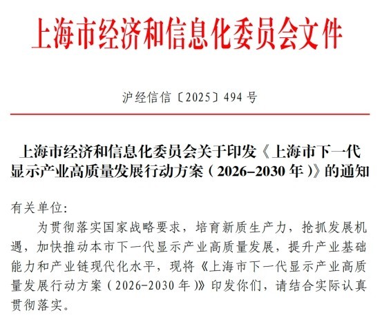 近期,上海市经济和信息化委员会正式发布《上海市下一代显示产业高质量发展行动方案(2026-2030年)》(以下简称《方案》)。