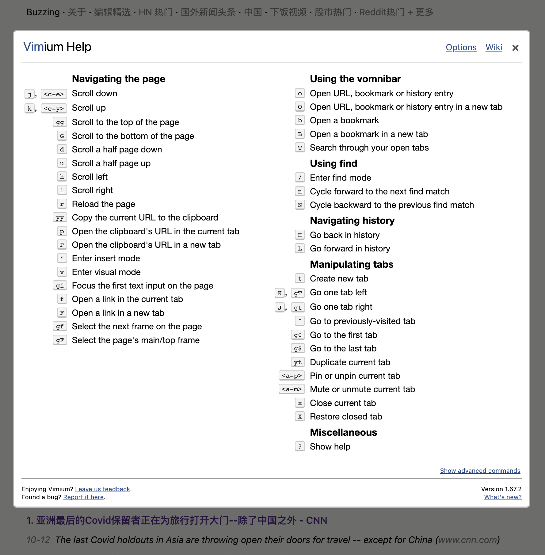 更多操作你可以自己去探索,另外还有一个类似的插件叫Surfingkeys, 据说更强大,但是我看了一眼似乎更复杂,我觉得这个 vimium 已经足够我用了,欢迎进入 mouseless 世界!