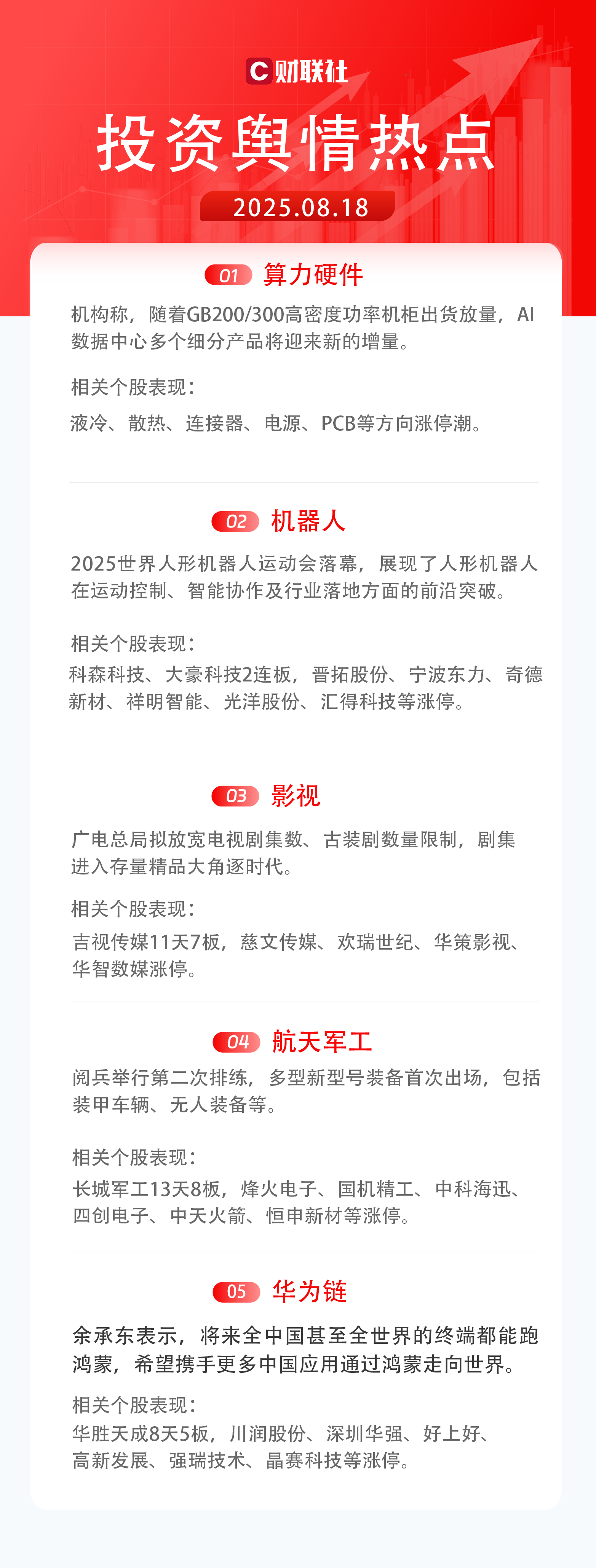 【今日投资舆情热点】1)算力硬件:机构称,随着GB200/300高密度功率机柜出货放量,AI数据中心多个细分产品将迎来新的增量。2)机器人:2025世界人形机器人运动会圆满落幕,全面展现了人形机器人在运动控制、智能协作及行业落地方面的前沿突破。3)影视:广电总局拟放宽电视剧集数、古装剧数量限制,剧集进入存量精品大角逐时代。4)航天军工:阅兵举行第二次排练,多型新型号装备首次出场,包括装甲车辆、无人装备等。5)华为链:余承东表示,将来全中国甚至全世界的终端都能跑鸿蒙,希望携手更多中国应用出海,通过鸿蒙框架走向世界。