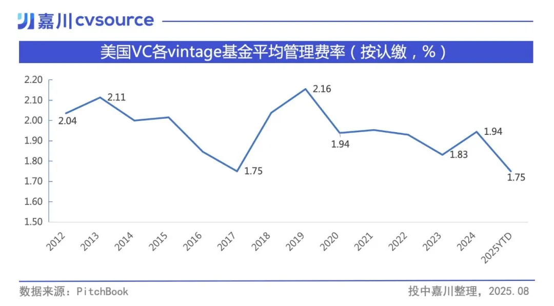 这一数据与美国市场的水平基本持平,2024年美国市场的VC管理费率平均为认缴的1.94%,2025年为1.75%。所以从管理费率来看,中美两国的差异较小。