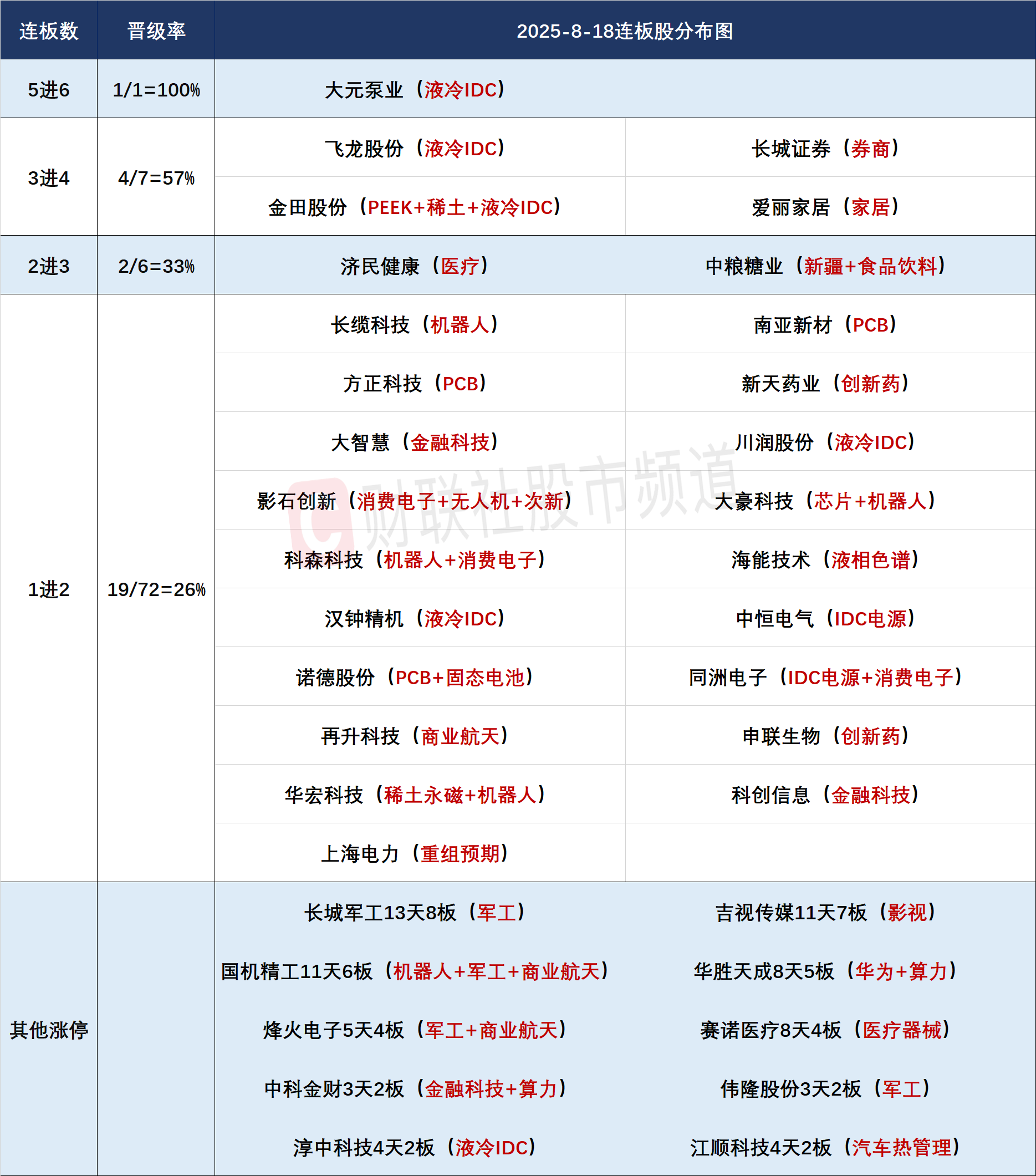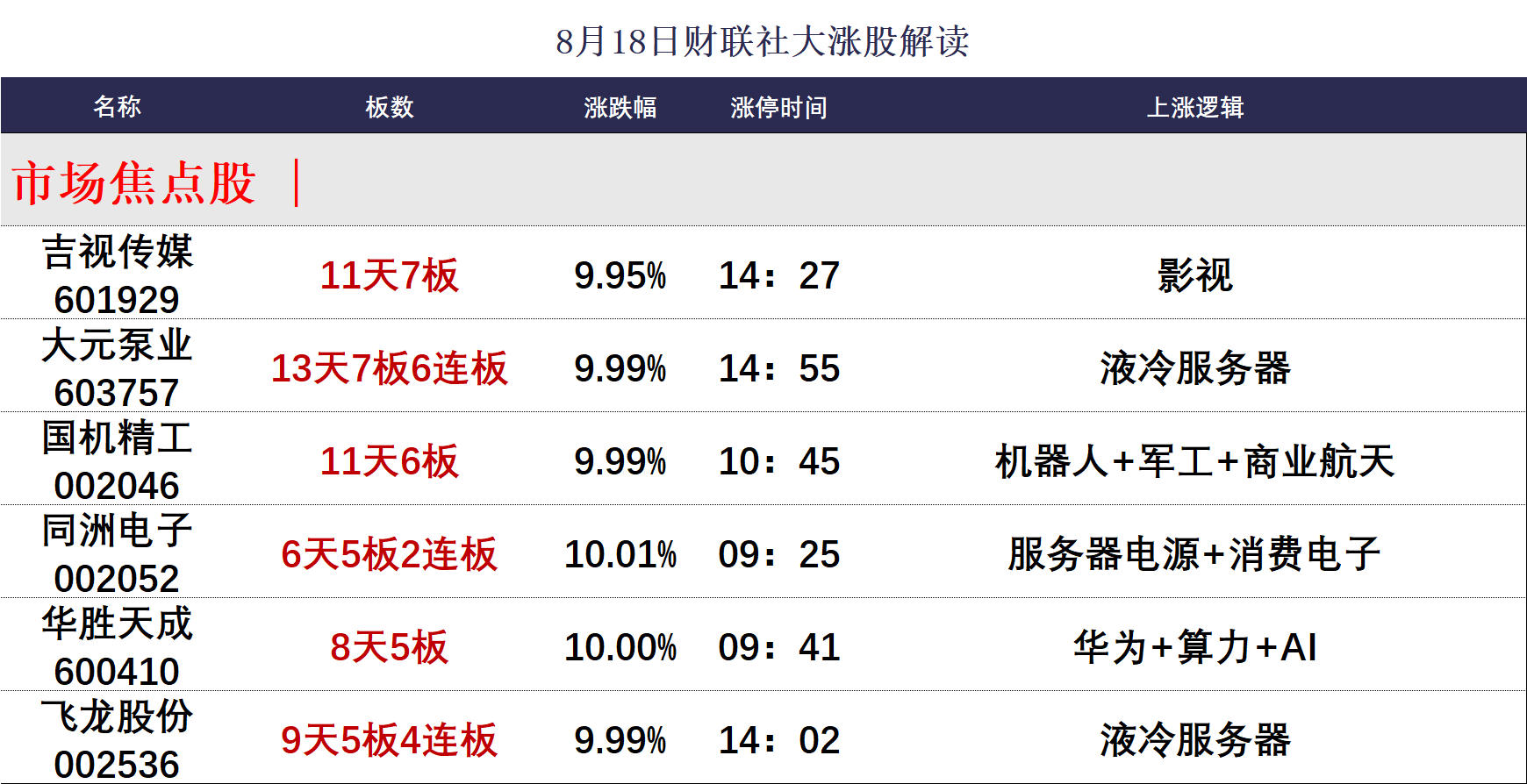 财联社8月18日讯,今日108股涨停,43股炸板,封板率为71%,大元泵业6连板,长城证券、金田股份、飞龙股份、爱丽家居4连板,中粮糖业、济民健康3连板,北交所海能技术30cm2连板,吉视传媒11天7板,国机精工11天6板,同洲电子6天5板,华胜天成8天5板。市场全天冲高回落,沪指创近10年新高,北证50创历史新高,深成指、创业板指均突破去年10月8日高点。沪深两市全天成交额2.76万亿,较上个交易日放量5196亿,成交额再创年内新高。板块方面,液冷服务器、影视、CPO、稀土永磁等板块涨幅居前,煤炭、有色金属、钢铁等板块跌幅居前。截至收盘,沪指涨0.85%,深成指涨1.73%,创业板指涨2.84%。