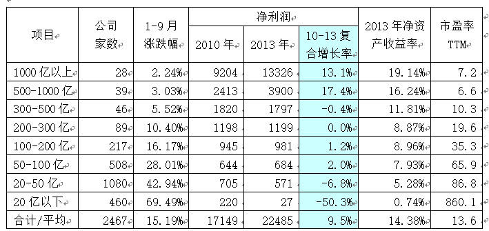 2014年前9个月市场走势显示,市值20亿元以下股票平均涨幅高达69.49%,市值300亿-500亿元股票平均涨幅为5.52%,市值1000亿元以上的上市公司平均涨幅仅为2.24%;市场越小,涨幅越大,小盘股的涨幅远高于大盘股。