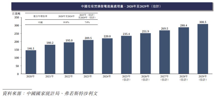 预计2025年至2029年,全国垃圾焚烧发电进厂处理量的复合年增长率为7%,到2029年将达到3亿吨以上。