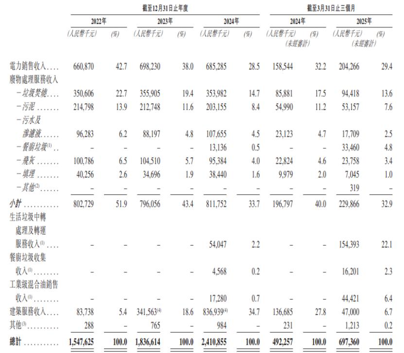 具体来看,2022年至2025年前三个月,军信股份的电力销售收入占总收入的比例从42.7%降至29.4%;废物处理服务收入占比从51.9%降至32.9%;生活垃圾的中转处理、压缩及转运业务从2024年开始产生收入,2025年1-3月占比为22.1%;餐厨垃圾收集、工业级混合油销售等业务收入占比较低。