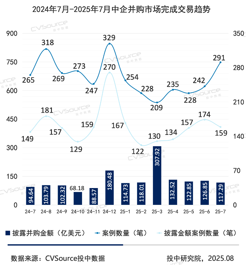 投中嘉川CVSource显示,2025年7月中国并购市场呈现“预案量缩价升、完成量增价稳”的格局。全月共披露并购预案405笔,同比下降25.28%,但完成交易291笔,同比增长9.81%。在金额方面,完成交易总额达到117.29亿美元,同比上升23.93%,显示出市场执行效率提升与信心逐步修复的特征。