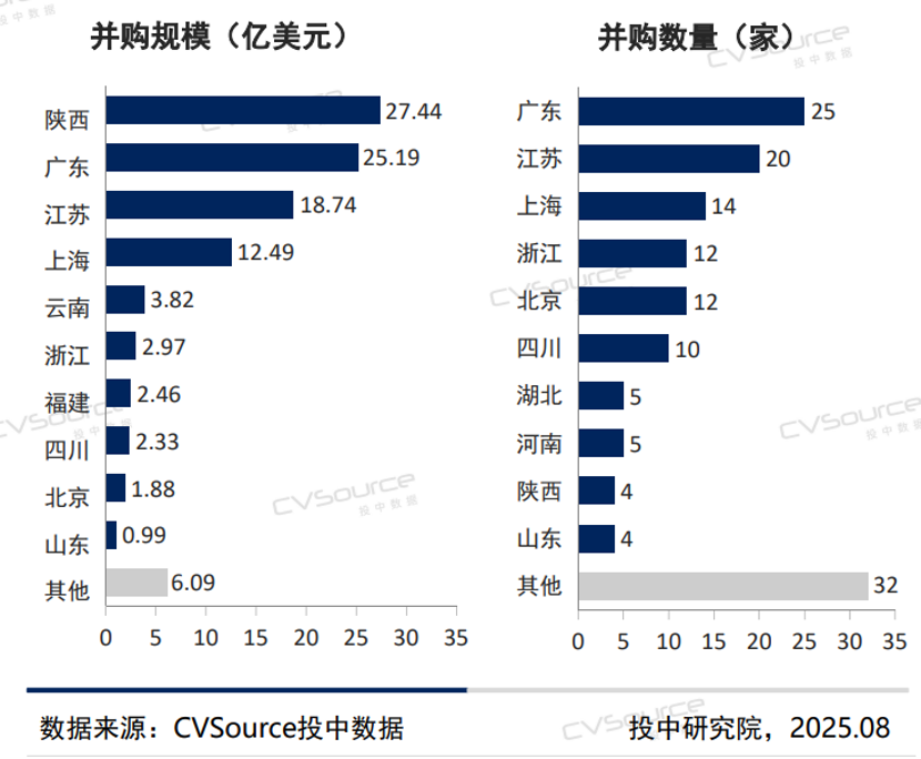 从地域来看,陕西省凭借大型能源矿业交易位列并购规模全国第一,其规模为27.44亿元;广东则在交易数量上继续领先,一共有25笔交易。