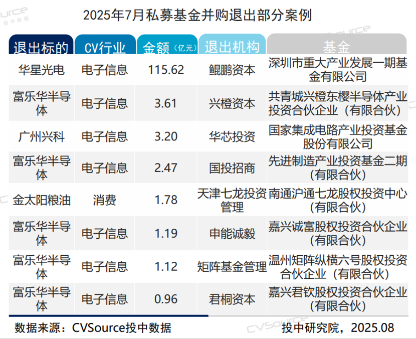 而最引人注目的,当属发生在7月1日的这笔交易——TCL科技集团斥资115.62亿元人民币收购华星光电21.53%股权,卖方为深圳鲲鹏资本管理的深圳市重大产业发展一期基金。随着交易完成,深圳国资实现一次性回笼115.62亿元人民币,不仅成为当月并购退出的“单笔之最”,更占到7月基金并购退出总额的近八成。