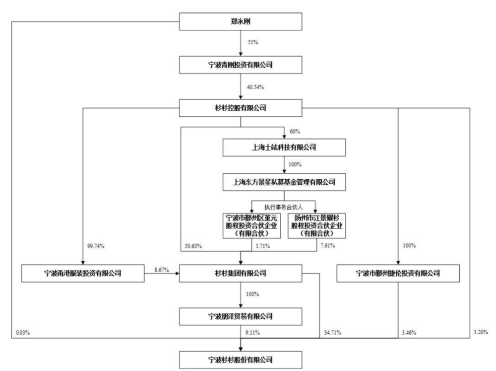 第二层是杉杉控股有限公司,郑永刚通过宁波青刚投资有限公司,持有杉杉控股40.54%股权,为其第一大股东并对其实施控股。