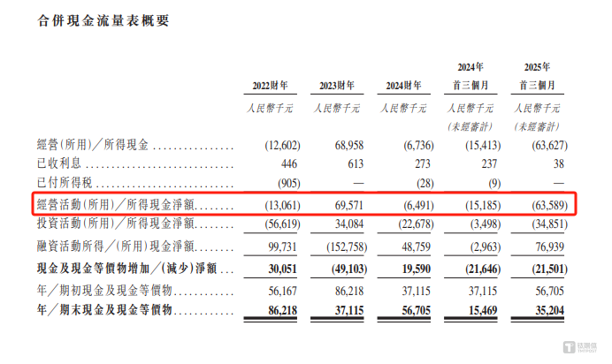 笔者注意到,海清智元的业绩表现对单一产品存在极强依赖性,多光谱AI产品每年贡献的营收占比超90%,产品结构高度单一的特征显著。值得关注的是,依托该产品的持续发力,公司业绩呈现明显改善,自2024财年起成功实现扭亏为盈,但需要明确的是,这种账面盈利的改善并未同步转化为健康的现金流,公司经营性现金长期处于净流出状态,凸显出盈利质量不佳的问题。