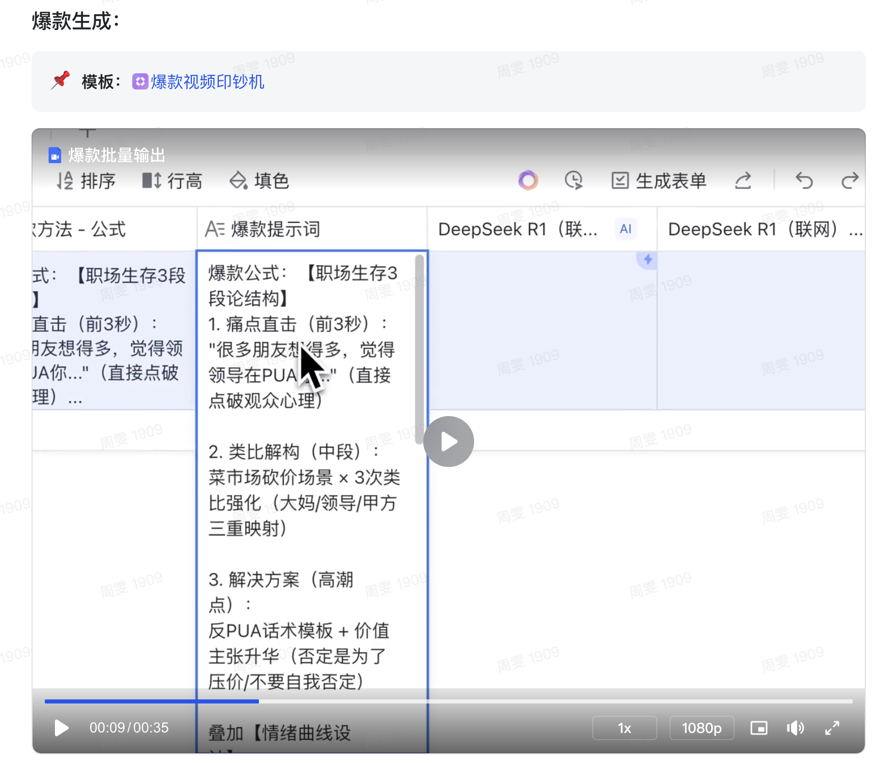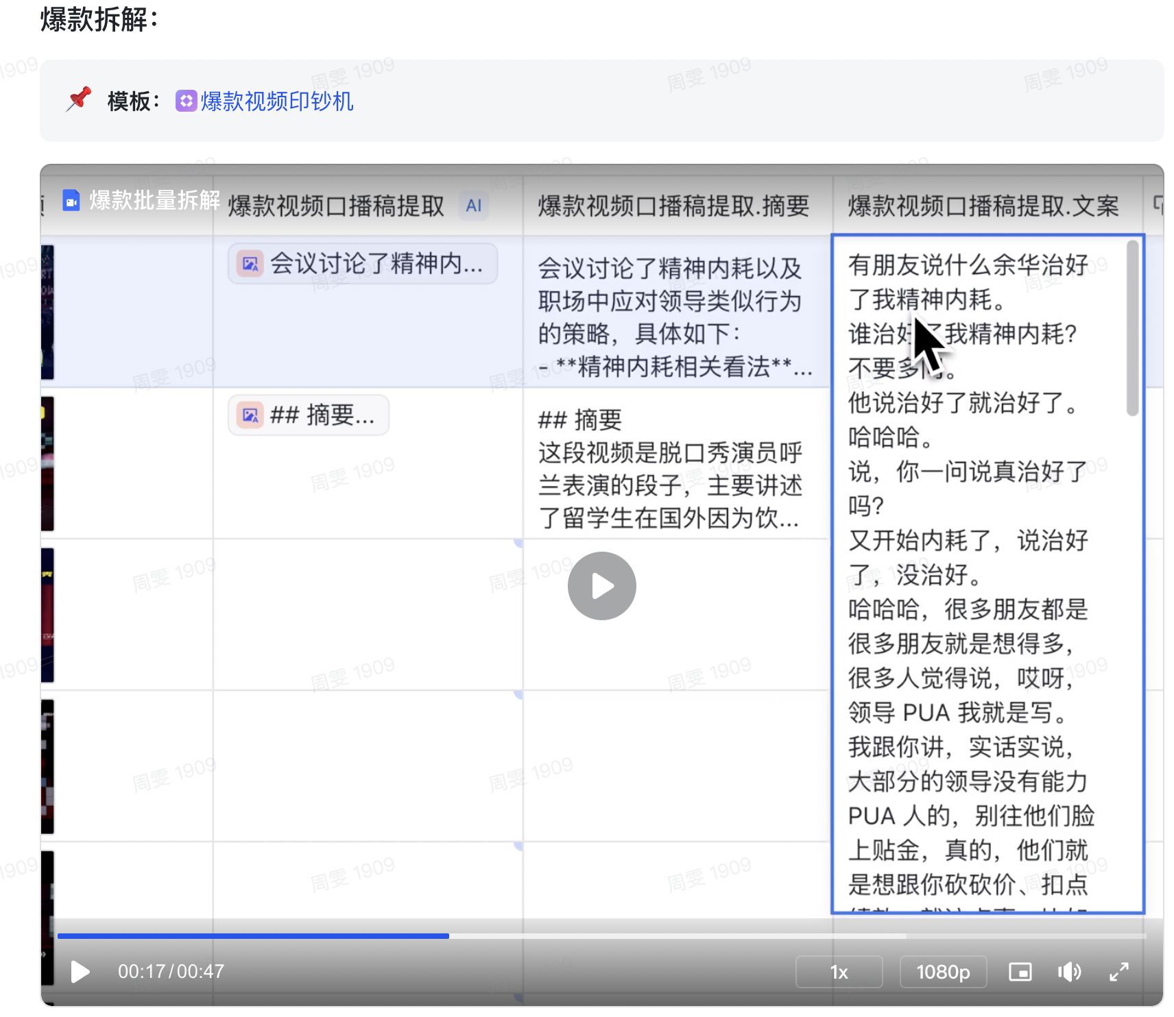 但最新版本的飞书多维表格已经可以嵌入,爆款抓取,爆款筛选,爆款生成功能了,把某个达人主页的网页版链接输入后,就可以得到一个表格,里面覆盖了视频数据、文案、链接等等,针对长视频,还有AI总结功能,至于那些搞电商直播的,甚至可以在表格里直接生成AI文案