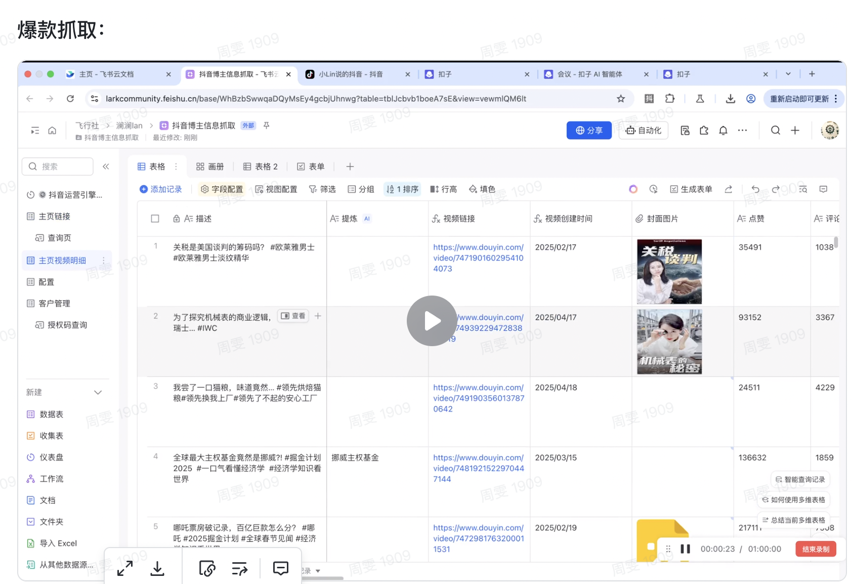 🚀 **AI驱动的爆款分析与抓取**:飞书多维表格新增的AI字段功能,能够直接抓取并分析特定达人主页的爆款内容,将视频数据、文案、链接等信息结构化呈现,省去了传统手动搜索和提取的繁琐步骤。