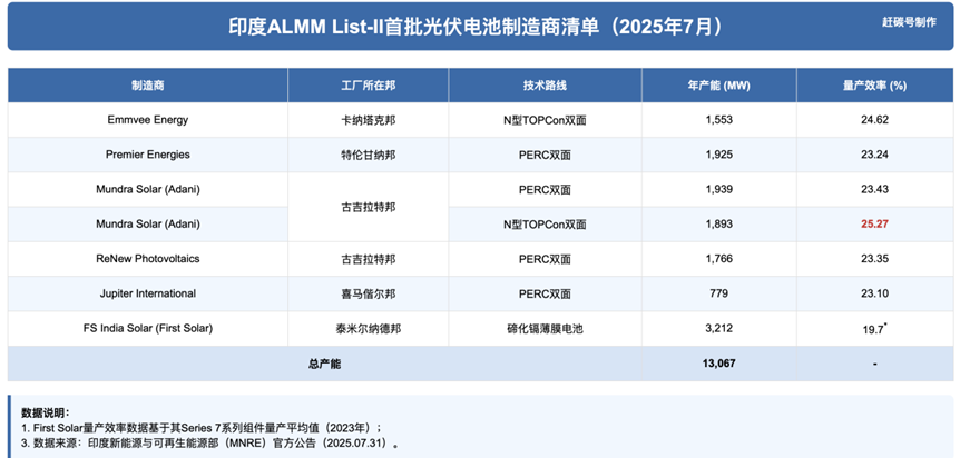 今年7月31日,印度首次公布的审批文件ALMM (List-II)中,6家制造商合计13GW的光伏电池产品获批,能够在未来获得政策支持并参与印度电力市场招投标。