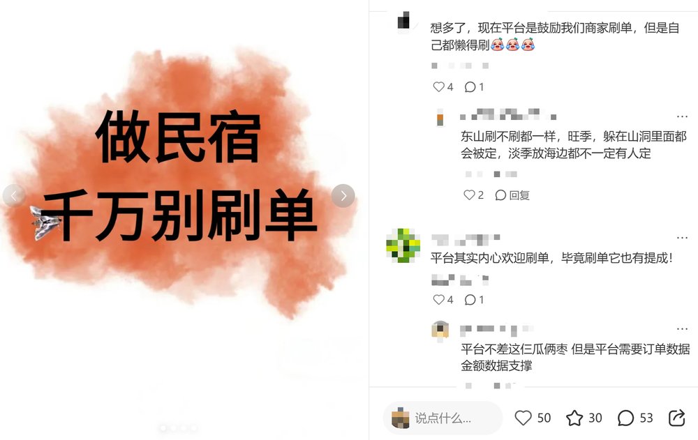以至于在小红书上,一些劝酒店别刷单的帖子下面都是求教程、求指导的酒店老板们。明知不可为还硬要为,是真没招了。