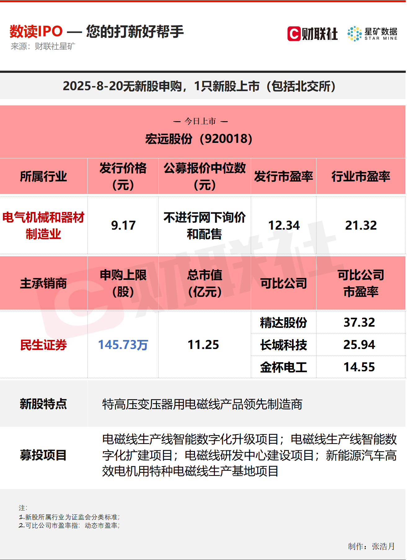 财联社8月20日讯,今日无新股申购,有1只新股上市,为北交所的宏远股份。