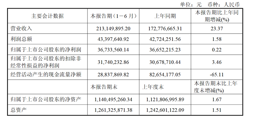 半年报显示,天承科技营业收入为2.13亿元,同比上升23.4%;归母净利润为3673万元,同比上升0.2%;扣非归母净利润为3174万元,同比上升3.5%。