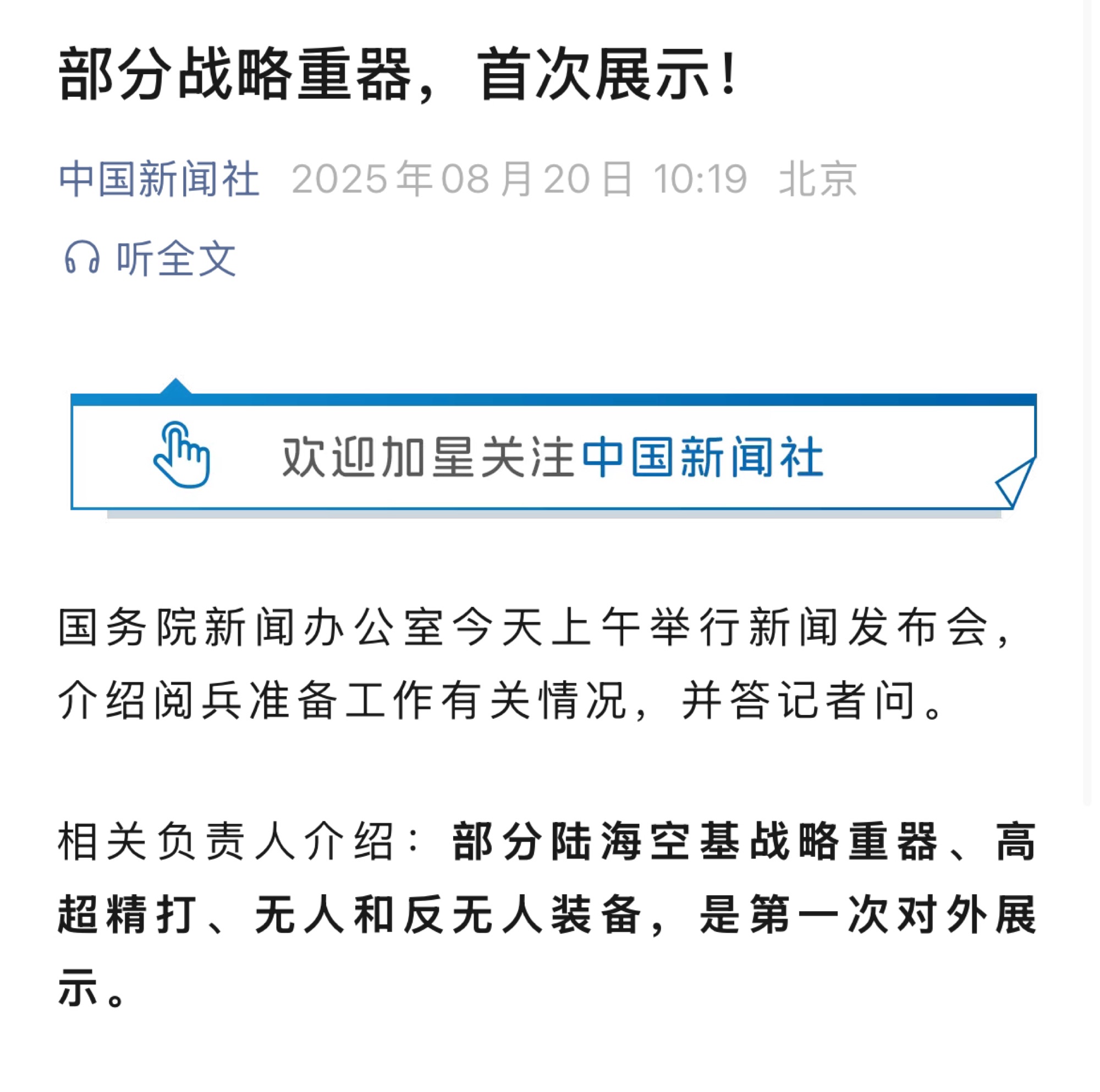 今天上午举行新闻发布会,介绍阅兵准备工作有关情况,并答记者问。相关负责人介绍: 部分陆海空基战略重器、高超精打、无人和反无人装备,是第一次对外展示 。 S新劲刚(sz300629)S :公司在反无人机领域已建立起全面的技术和产品体系,涵盖低慢小目标雷达、无线电侦测设备以及相关反制设备。其无人机相关技术已研发成熟,覆盖侦查无人机配套、雷达侦测、电子干扰等领域。子公司康泰威还从事军工新材料业务,包括隐身材料的研发和生产,其隐身材料应用于歼二十隐形战斗机等国之重器。此次阅兵中若有无人和反无人装备展示,
