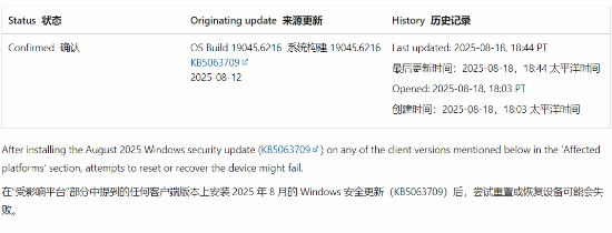 根据微软的说明,某些Windows版本在安装了2025年8月的安全更新(补丁编号:KB5063709)后,用户尝试重置或恢复设备时可能会遇到失败的情况。