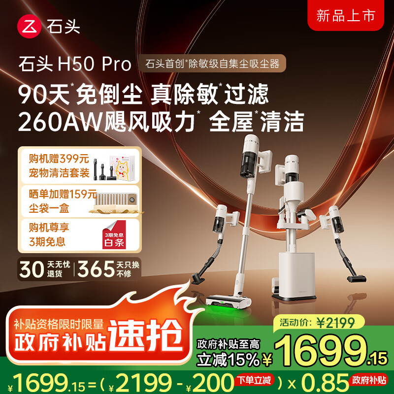 💰 **上市价格与优惠信息**:石头H50 Pro无线自集尘吸尘器预购价格为1999元。部分地区用户可享受国家补贴,补贴后价格约为1699.15元,具有一定的性价比优势。