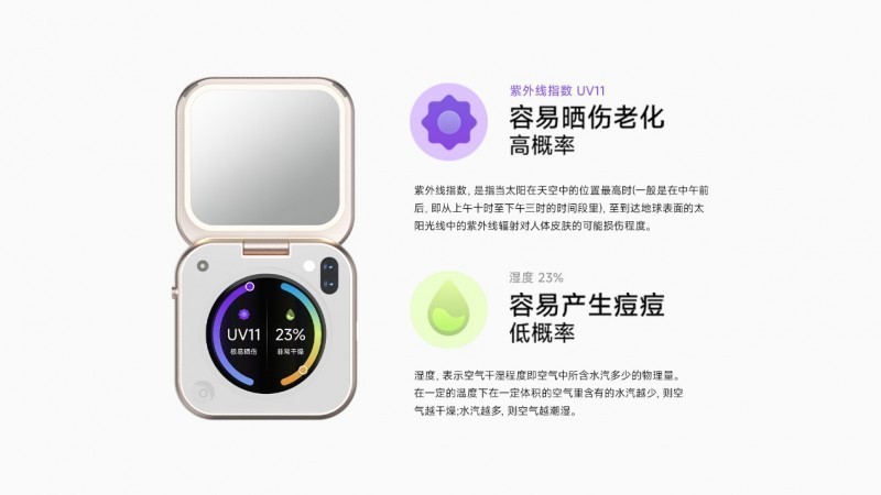 此外,小紫镜还可以查看当前环境的 UV 指数和湿度,让使用者能根据环境情况及时调整护肤和防晒策略。